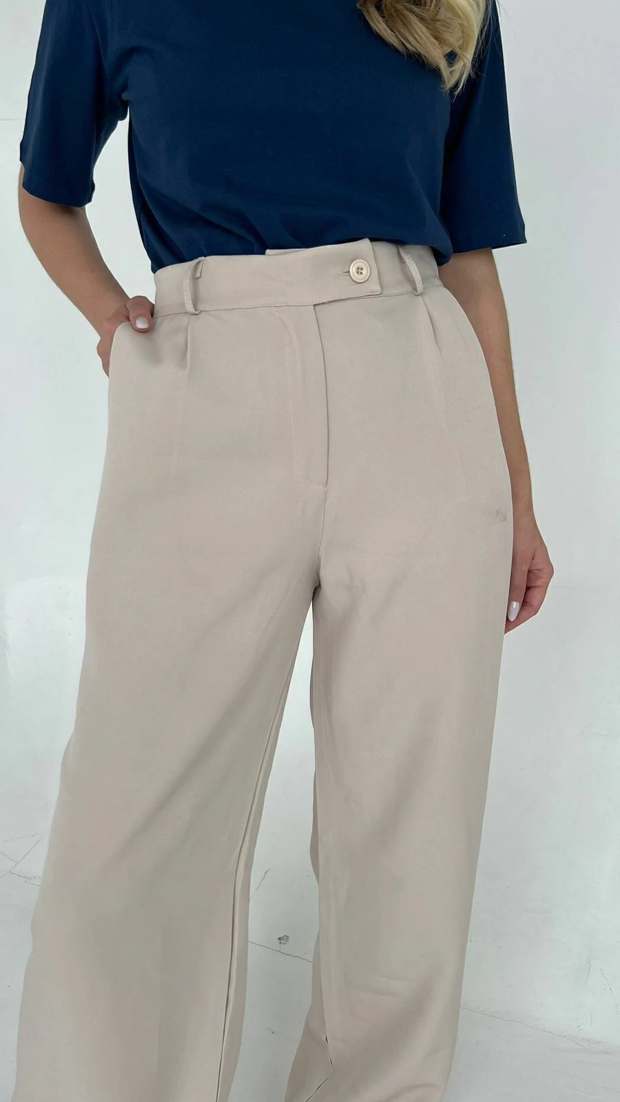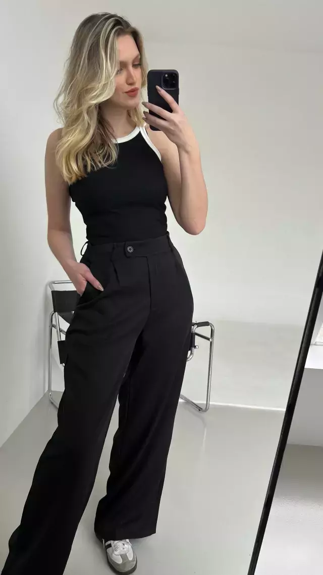 Calça com corte reto, cós alto. Detalhe de botão mais na lateral. Uma peça super estilosa, perfeita para usar com o body julia ou com tshirts. Vale com salto ou tênis, o importante é estar se sentindo maravilhosa.