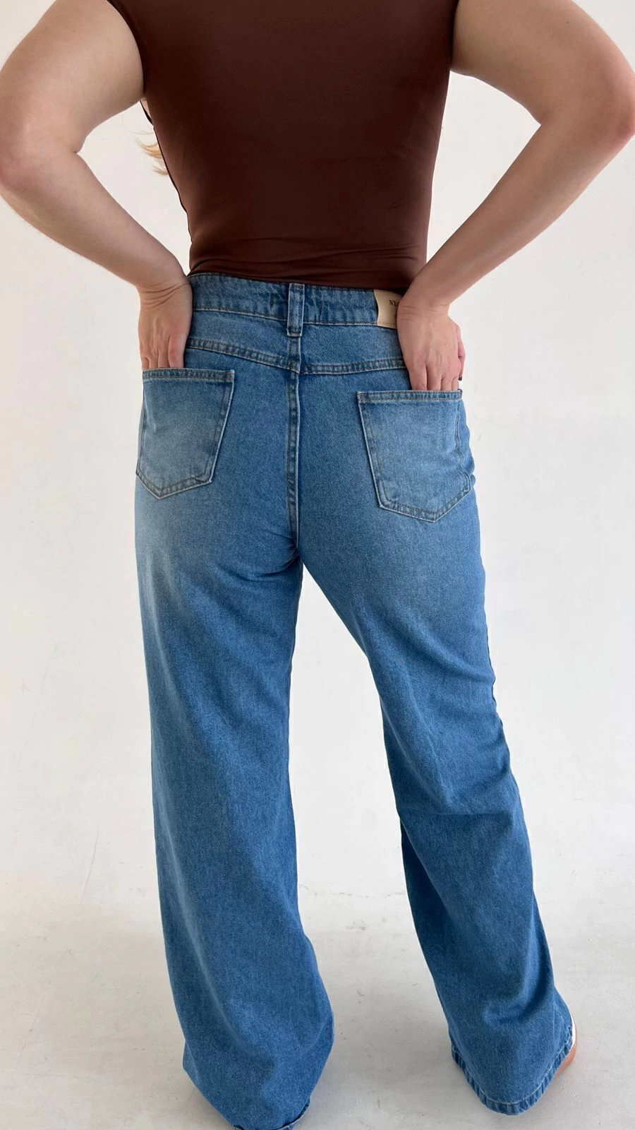 Calça Jeans wide com cós super alto, bolsos frontais e traseiros. Lavagem elegante e caimento impecável. Tecido 100% algodão macio e confortável ao corpo.
