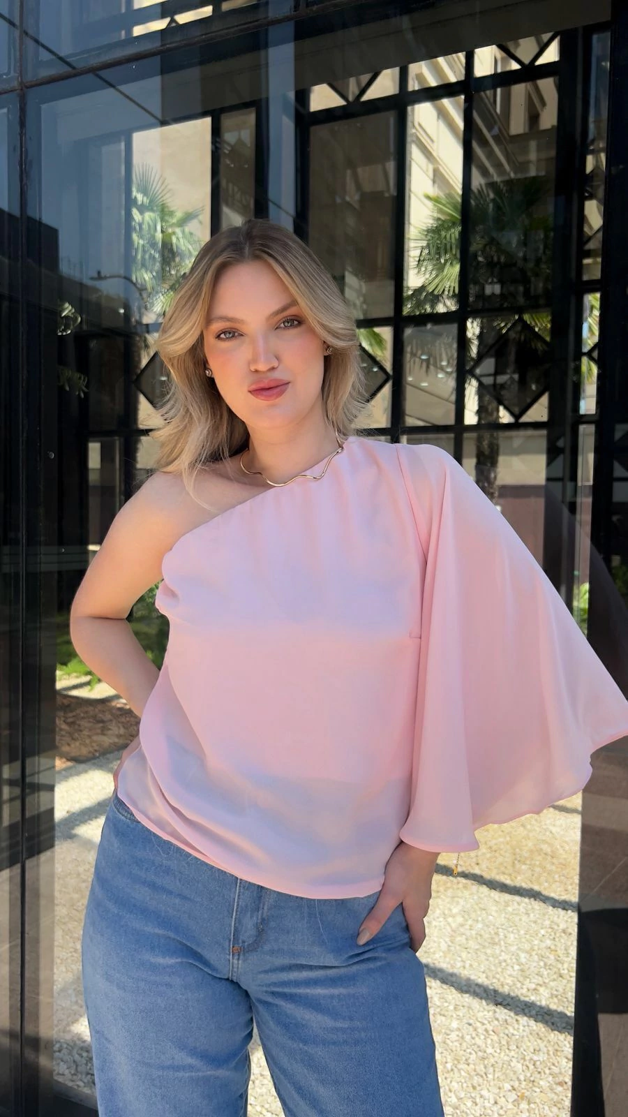Blusa de uma manga com elastico no colo. Possui forro e um tecido crepe seda super fluido e elegante.